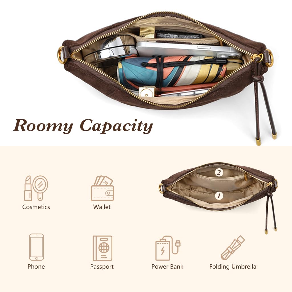 PALAY Shoulder Bag for Woman Brown Suede Crescent Crossbody Bag features a premium suede exterior in a vintage brown shade that offers timeless appeal and a soft, luxurious touch. This small yet functional handbag includes a distinctive knotted leather strap that combines durability with modern design. Measuring 27x7x15 cm, it provides ample space for everyday essentials such as a phone, wallet, and keys. The secure top zipper closure ensures belongings remain safe while maintaining a sleek silhouette. Ideal for both day and evening occasions, this PALAY suede crossbody bag complements casual and refined styles, reflecting the brand’s focus on quality craftsmanship and practical elegance.