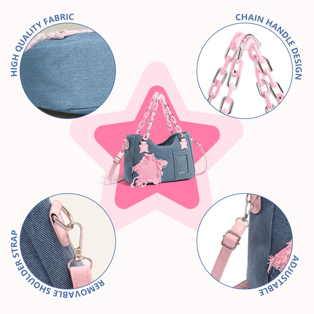 PALAY Shoulder Bag for Women Y2K Star Patchwork Denim Crossbody Bag Messenger Handbag showcases the brand’s playful interpretation of nostalgic Y2K denim fashion. Crafted from denim-style fabric with pink star accents, it combines retro charm with a modern sense of style. Its dual carrying options, including a pink link chain handle and detachable shoulder strap, offer comfort and versatility for daily wear. A clear photo window allows easy personalization, while the compact 26.5x9x18 cm structure keeps essentials organized. Ideal for school, shopping, or casual outings, this PALAY handbag blends cuteness, practicality, and individuality that reflects the brand’s focus on creative yet usable fashion accessories.