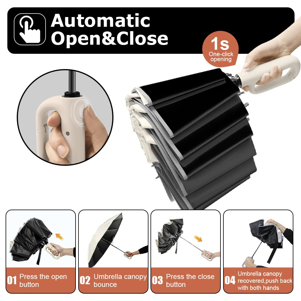 PALAY Large Umbrella for Men and Women features a 50-inch automatic open and close design that delivers reliable windproof performance and 99% UV protection for daily use and travel. Crafted with a reinforced shaft and 10 durable fiber ribs, it resists deformation under strong winds while remaining lightweight and portable. The patented award-winning handle with a carabiner-style buckle allows easy hanging on bags, belts, or hooks for convenient storage. Its ergonomic matte handle with a loop grip ensures comfortable holding, and the reflective strip enhances visibility in low-light conditions. Designed for commuters and travelers, PALAY combines durability, safety, and ease of use for dependable weather protection.