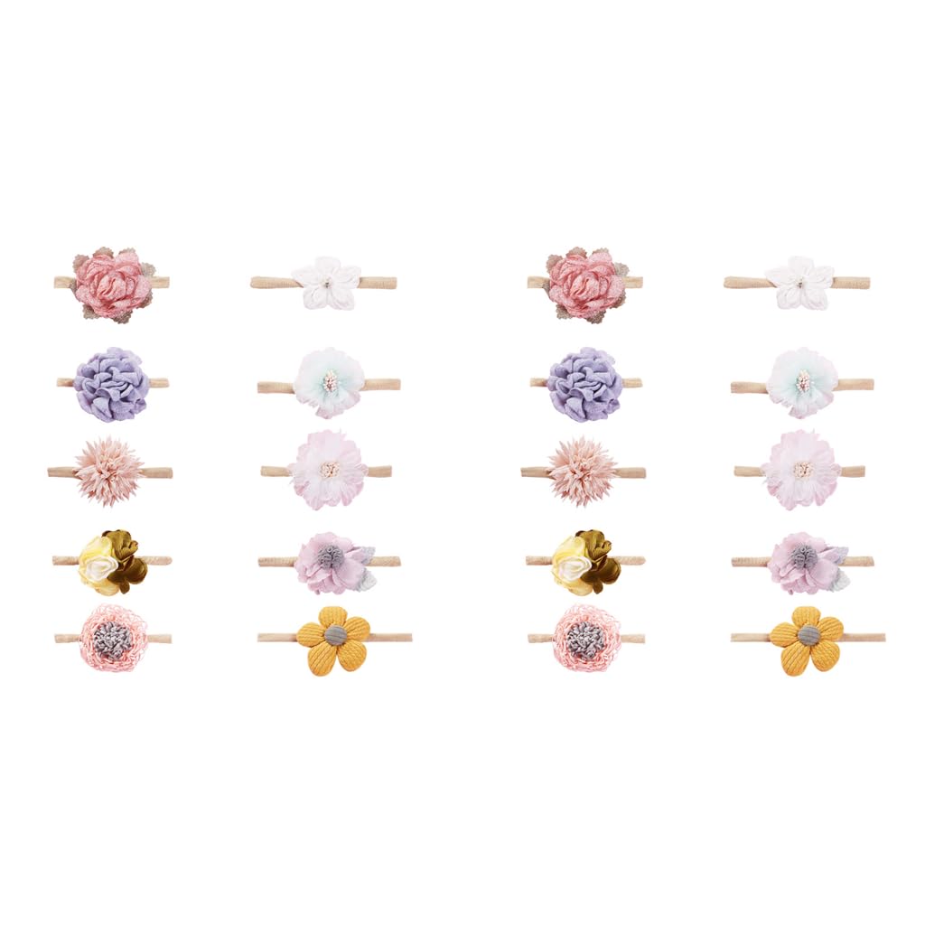 - Includes 20 soft elastic baby hair bands with handmade floral decorations.