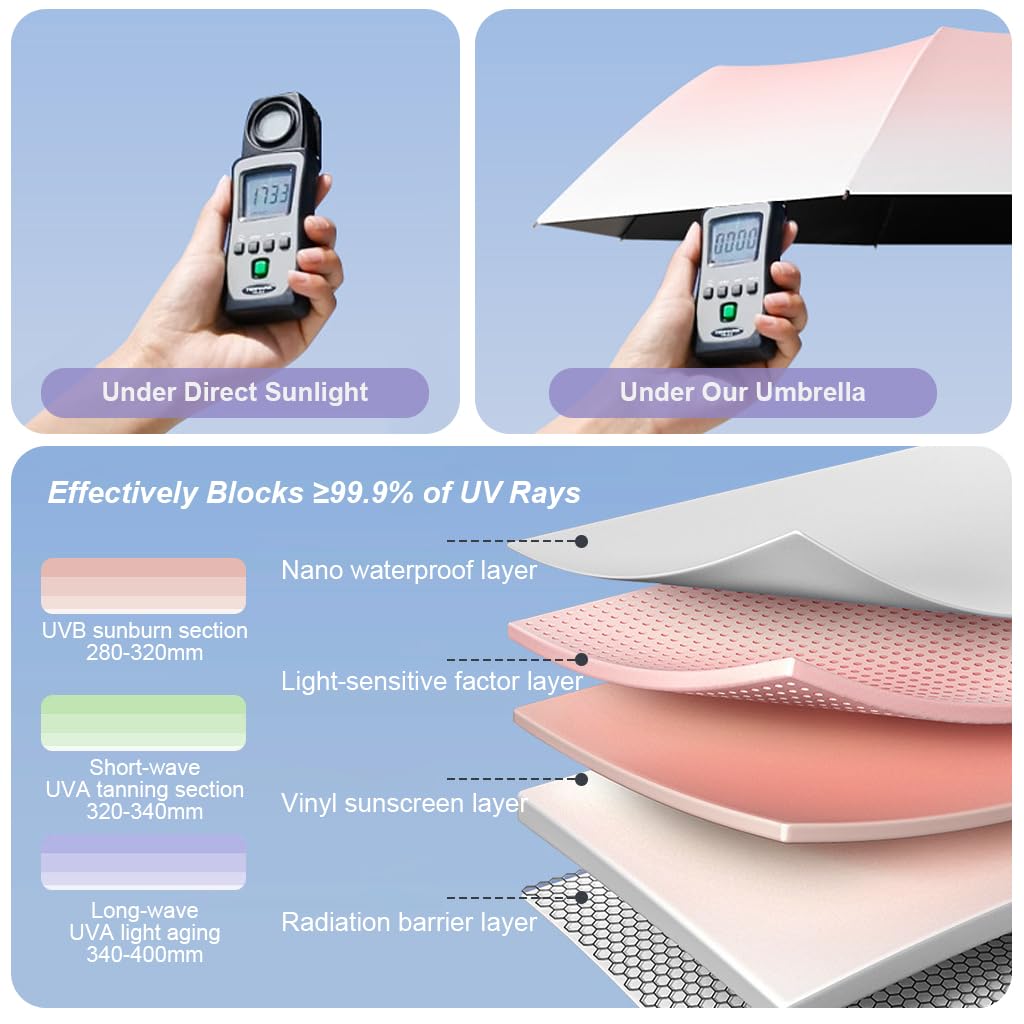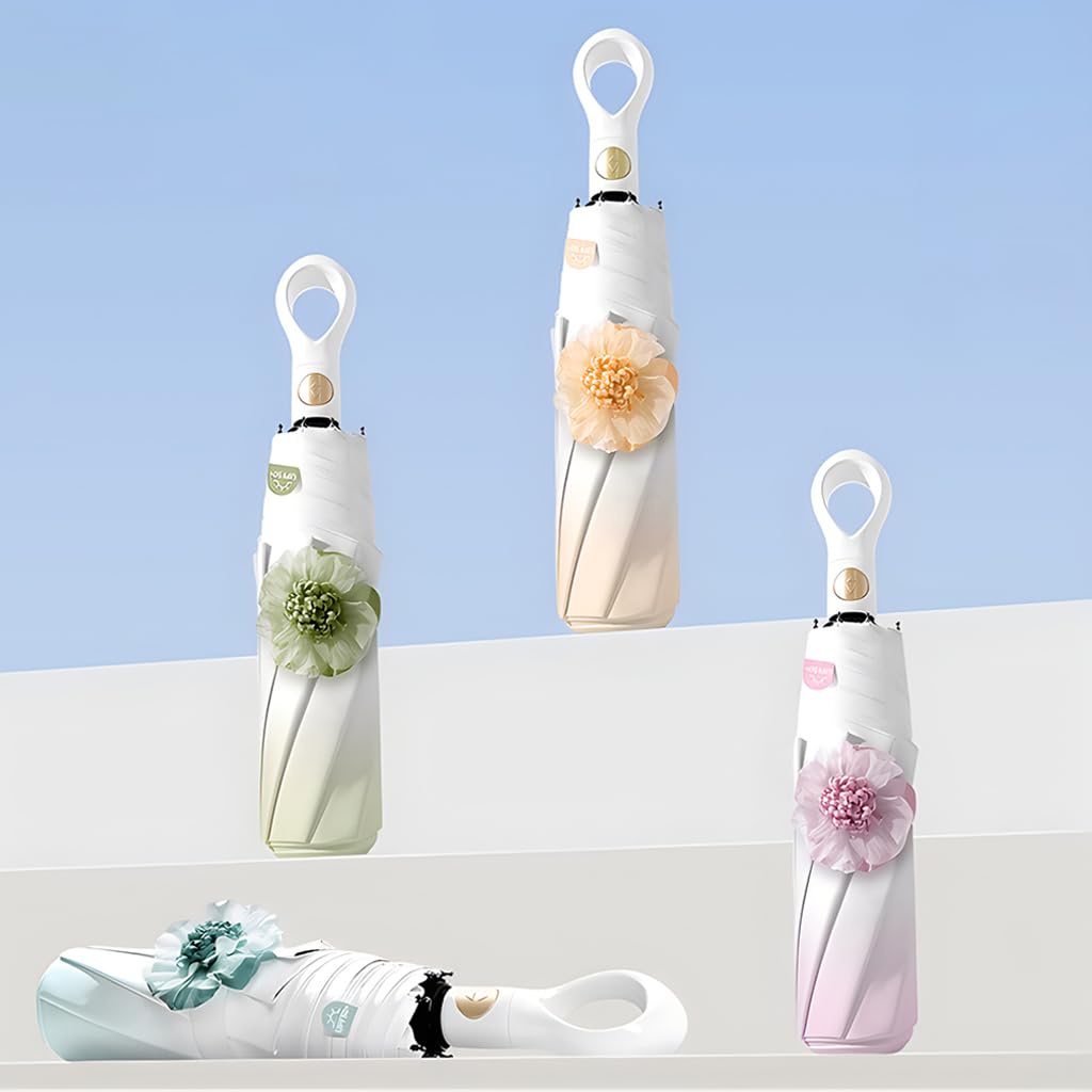 PALAY Compact Umbrella for Sun Rain Protection is a travel folding umbrella designed for daily commuting and outdoor use. Featuring UPF 50+ fabric and a black-coated liner, it provides reliable sun protection while keeping cool underneath. Its strong yet lightweight build includes a reinforced metal shaft and 8 fiberglass ribs that resist strong winds. The auto open and close button allows quick one-hand operation, and the anti-slip rubber handle with a hanging loop ensures comfort and convenience. With its stylish gradient pattern and charming flower strap, this compact 400g umbrella combines durability and fashion, making it a practical and dependable choice from PALAY for both sunny and rainy days.