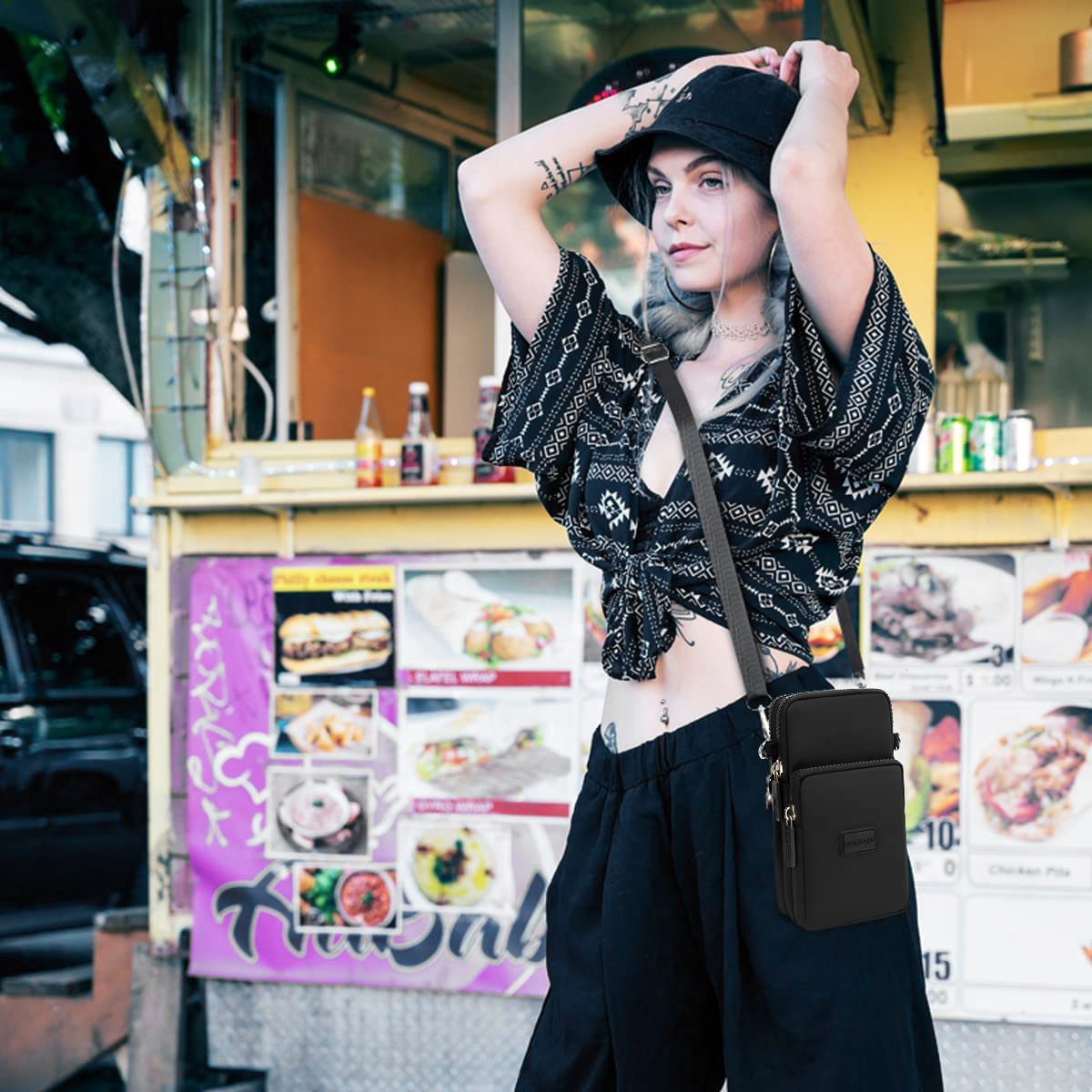 - Features three zippered compartments for organized storage of phone, cash, keys, and cosmetics.