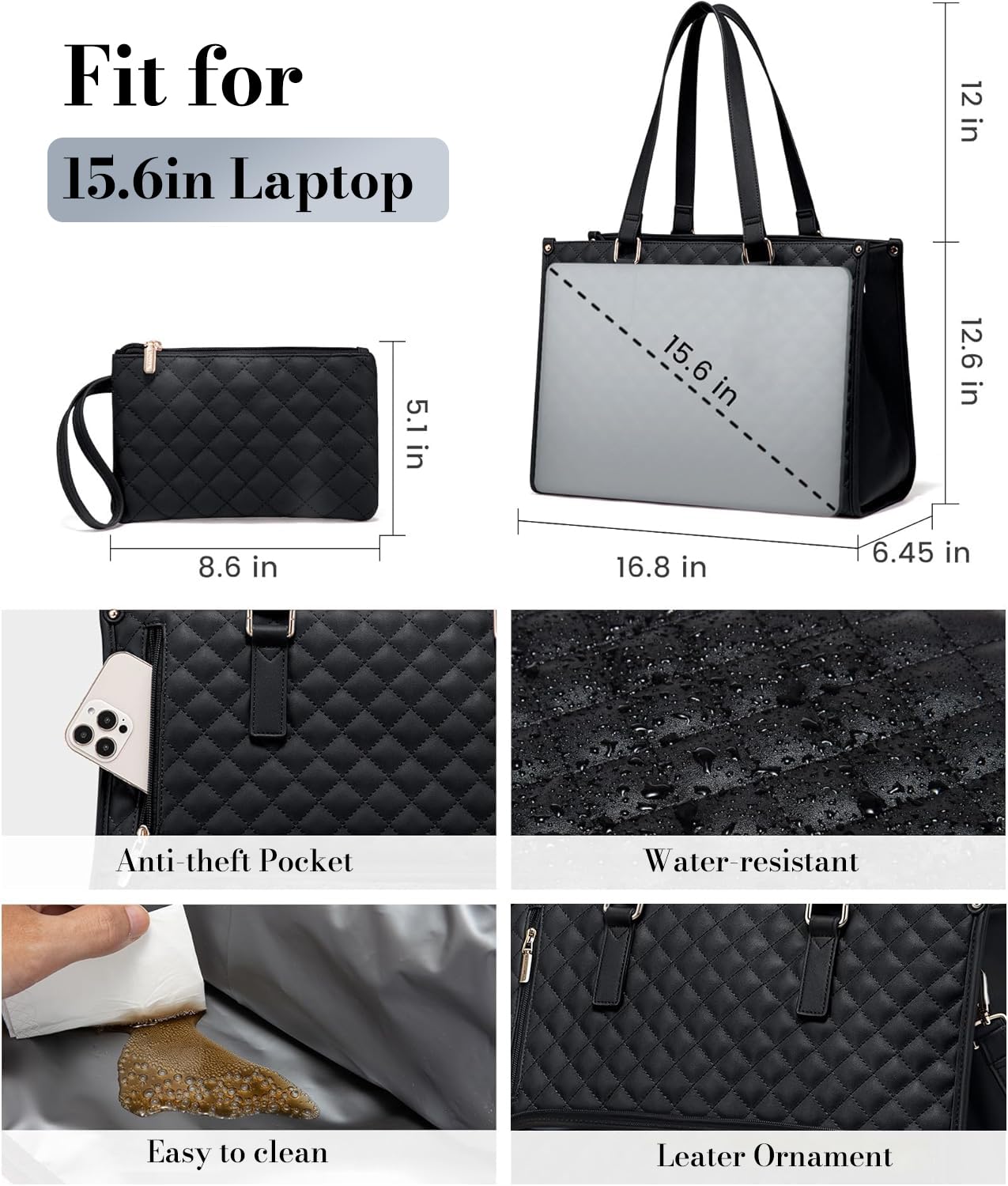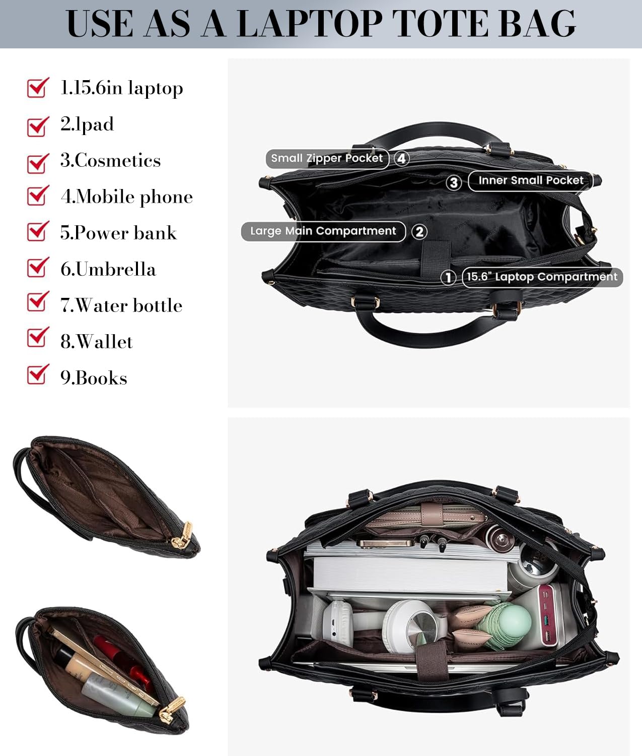 - The main compartment offers generous space to hold books, makeup, tech devices, and daily essentials in an organized way.