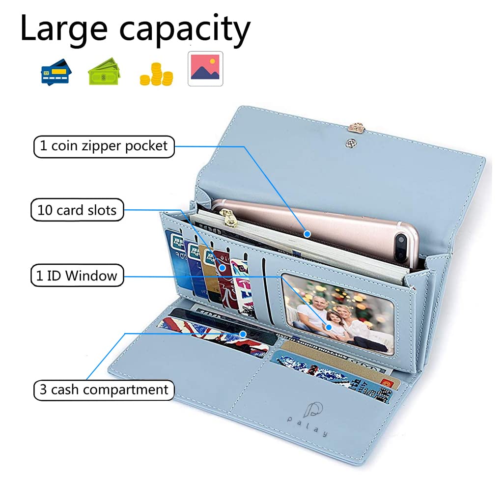 PALAY® Women's PU Leather Long Wallet with Leaf Pendant Card Holders Phone Pocket Girls Zipper Coin Purse is crafted from soft and durable PU leather made by skilled artisans with years of experience. Designed with 10 card slots, a clear ID window, one bill compartment, and a secure zipper pocket, it offers practical organization for cards, coins, and small phones. The RFID-blocking layer helps protect personal and payment information from unauthorized scanning. Compact in size, it fits easily into handbags or coat pockets while maintaining a neat appearance. Ideal for daily use or as a thoughtful gift, this PALAY® wallet combines functionality, comfort, and lasting style for modern women.